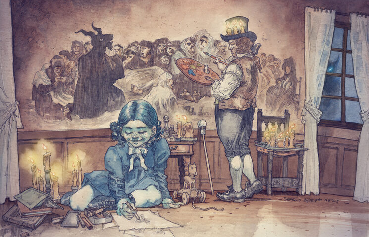Commission COLOR DinA3 a un precio especial. Una obra de arte original y personalizada como tú quieras. Realizada como acuarela ya gran formato, puedes encargar uno de los personajes de "El baile del vampiro", de "El pacto de Goya" (o de cualquiera de mis obras) en la actitud que te plazca, un retrato tuyo o de alguien que elijas. Cualquier cosa que seas capaz de imaginar yo seré capaz de dibujarla, incluyendo cualquier otro personaje real o ficticio. Como muestra aquí tienes las imagenes de algunas commissions solicitadas por mecenas en campañas anteriores.