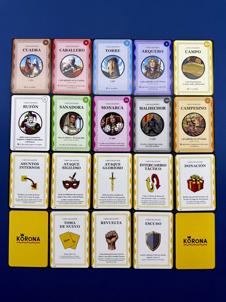 Se trata de un juego táctico y dinámico, de partidas rápidas de apenas 20 minutos que puedes llevar y jugar en cualquier lugar (¡incluso sobre la toalla en la piscina!). El apartado visual destaca por unas ilustraciones desenfadadas que dan vida a personajes de la época medieval; algunos de ellos, en la edición del juego de la Corona de Aragón, inspirados en figuras ilustres como Pedro IV el Ceremonioso, Jaime I el Conquistador, Leonor de Sicilia o Violante de Hungría. Pero el reino no se detiene ahí: desde caballeros, arqueros, campesinos y sanadoras hasta bufones y malhechores que harán de las suyas, todos forman parte del elenco de Korona con un estilo colorido y divertido